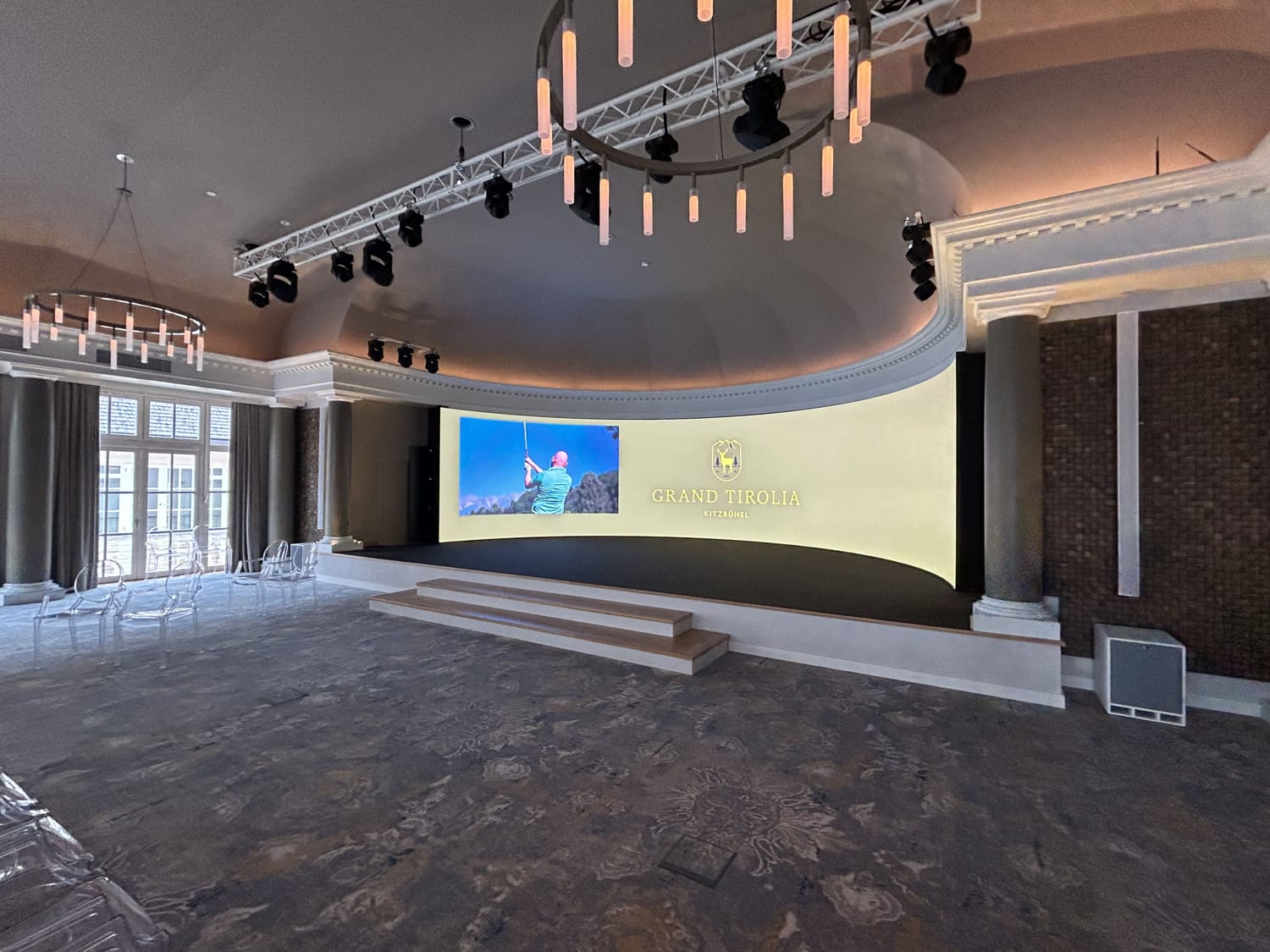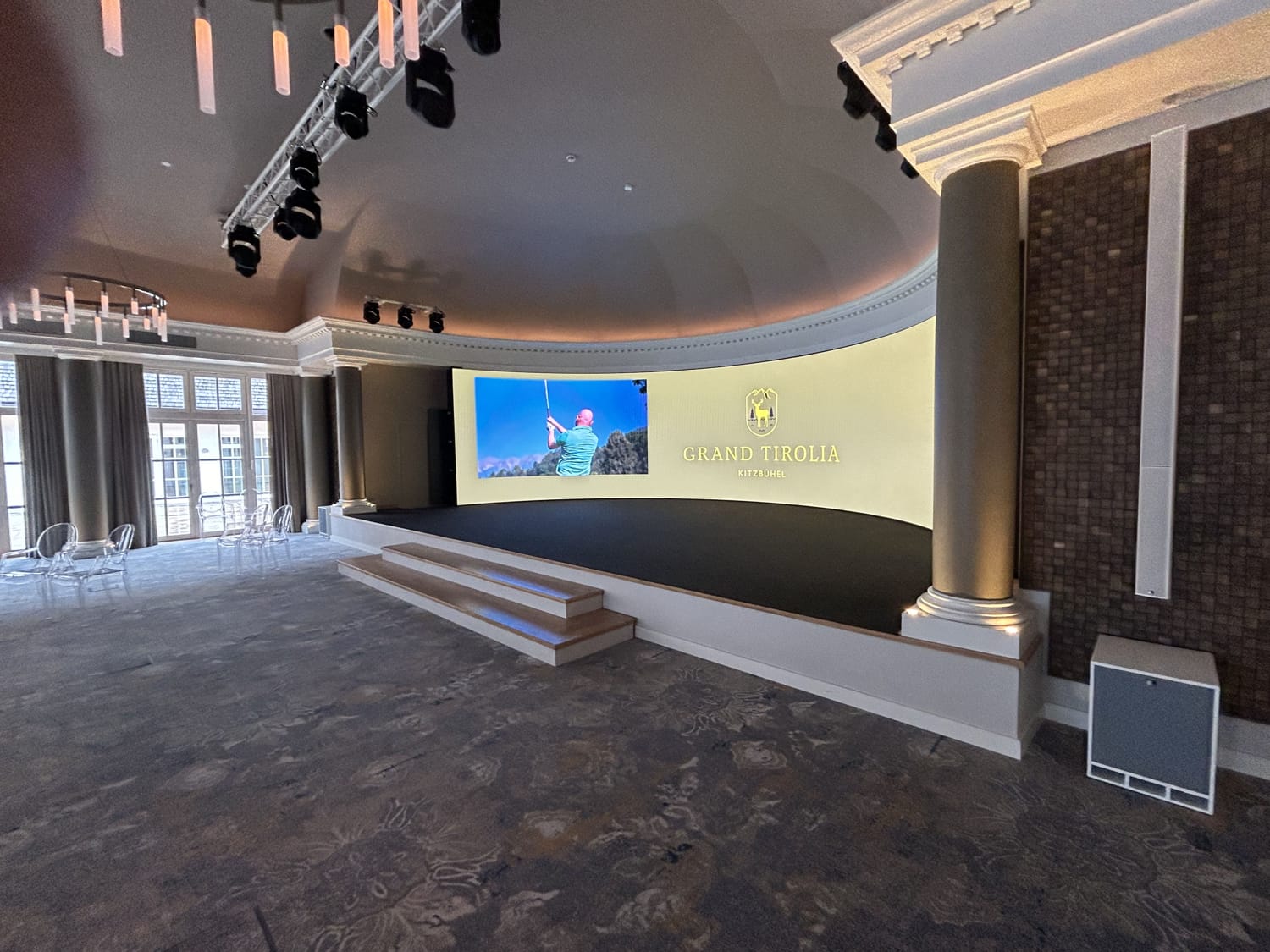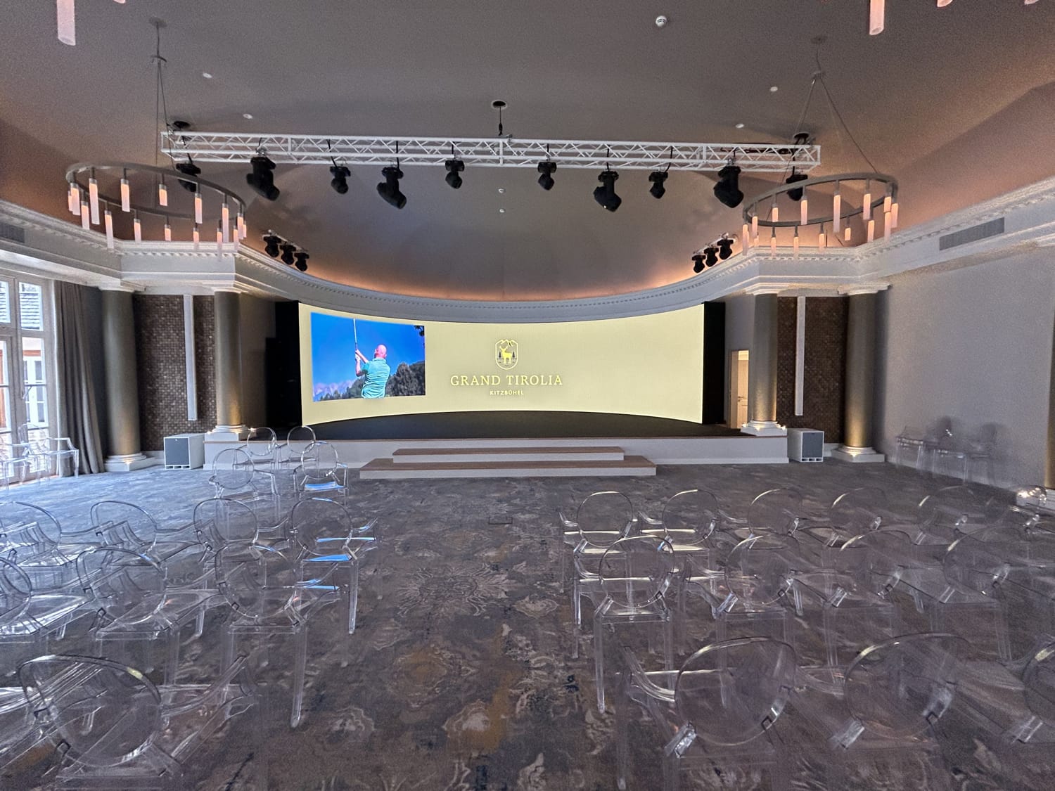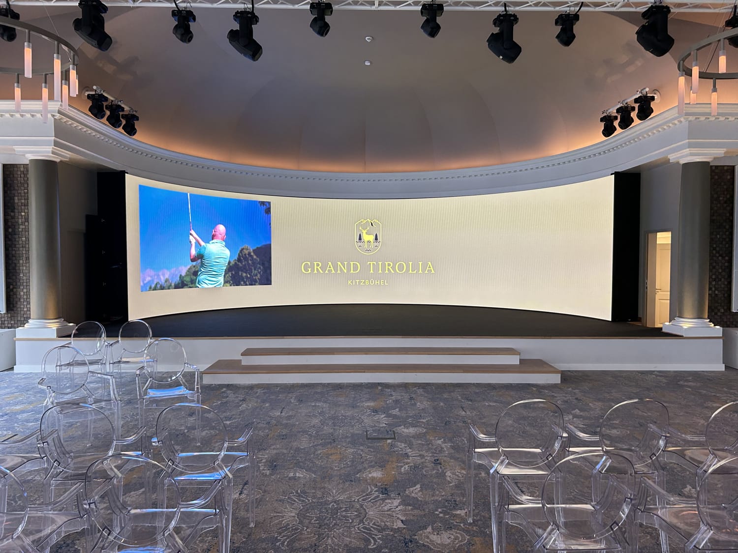 Unsere Partnerfirma Rogllivtec hat die gesamte technische Ausstattung des Veranstaltungsraums in Kitzbühel umgesetzt. Das LED-Display mit 2,6 mm Pixelabstand bietet 800 nit Helligkeit und eine beeindruckende Auflösung von 5.184 x 1.056 Pixeln auf einer Fläche von 13,5 x 2,75 Metern. Dank des curved Flex Modules mit Magnetbefestigung und einem Radius von ca. 4,50 Metern konnte das gebogene Display passgenau auf der bestehenden Bühne nach Naturmaß integriert werden und sorgt so für eine eindrucksvolle Präsentation.