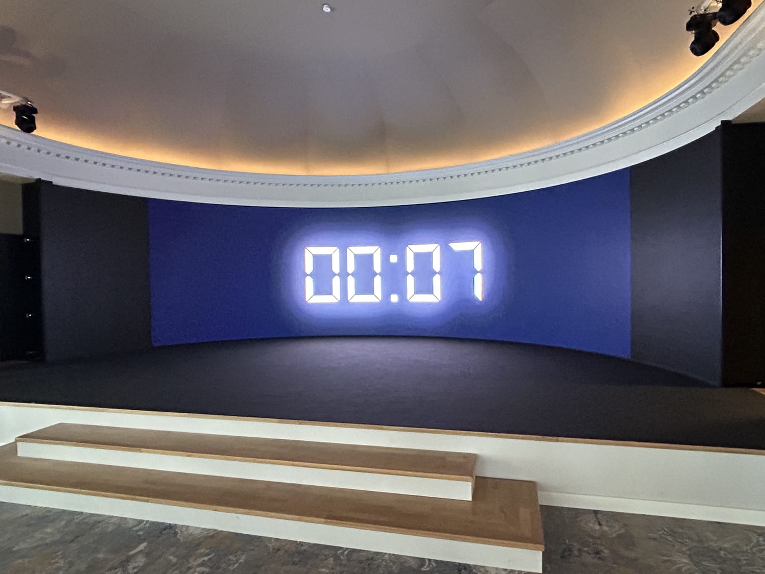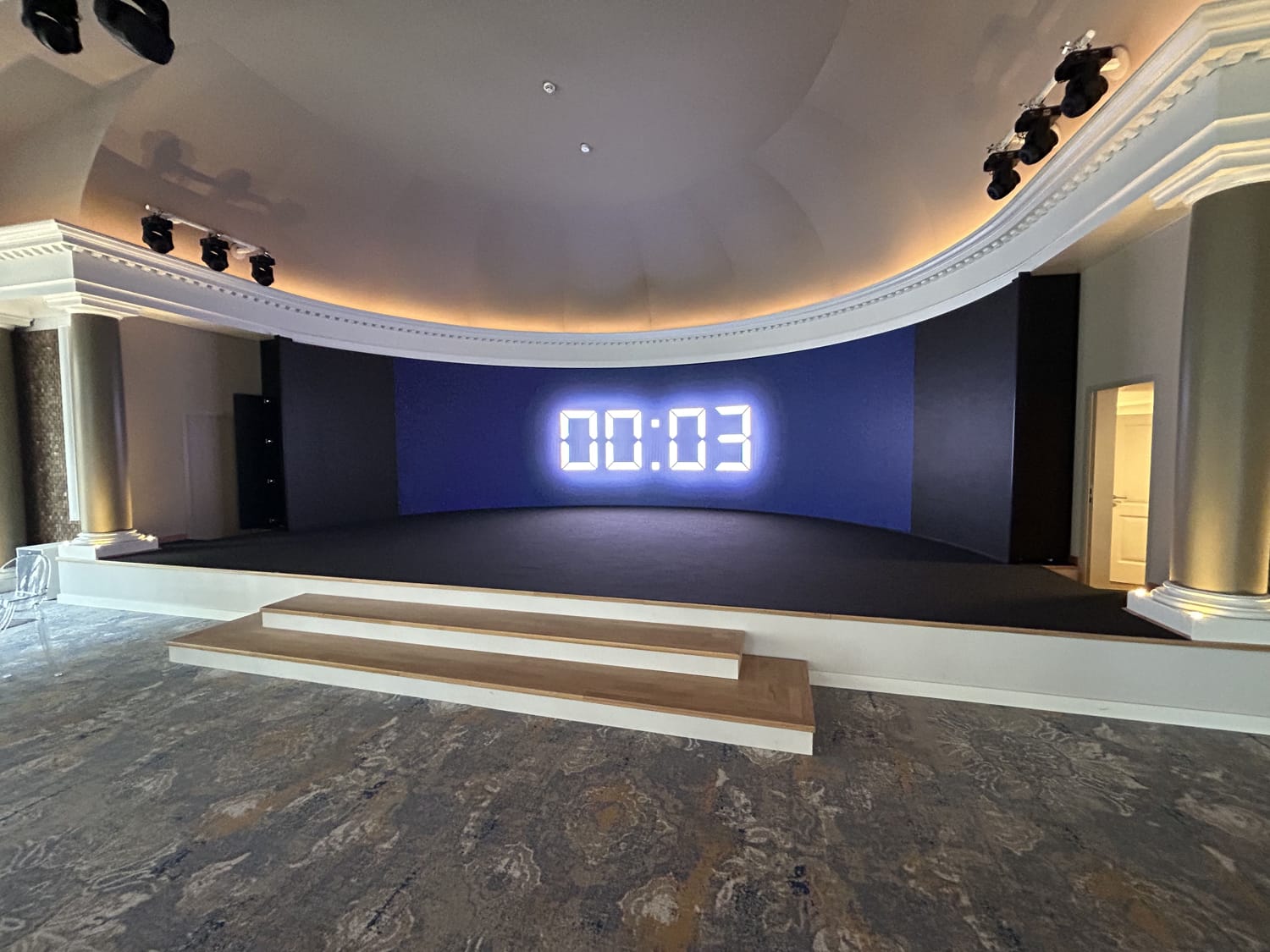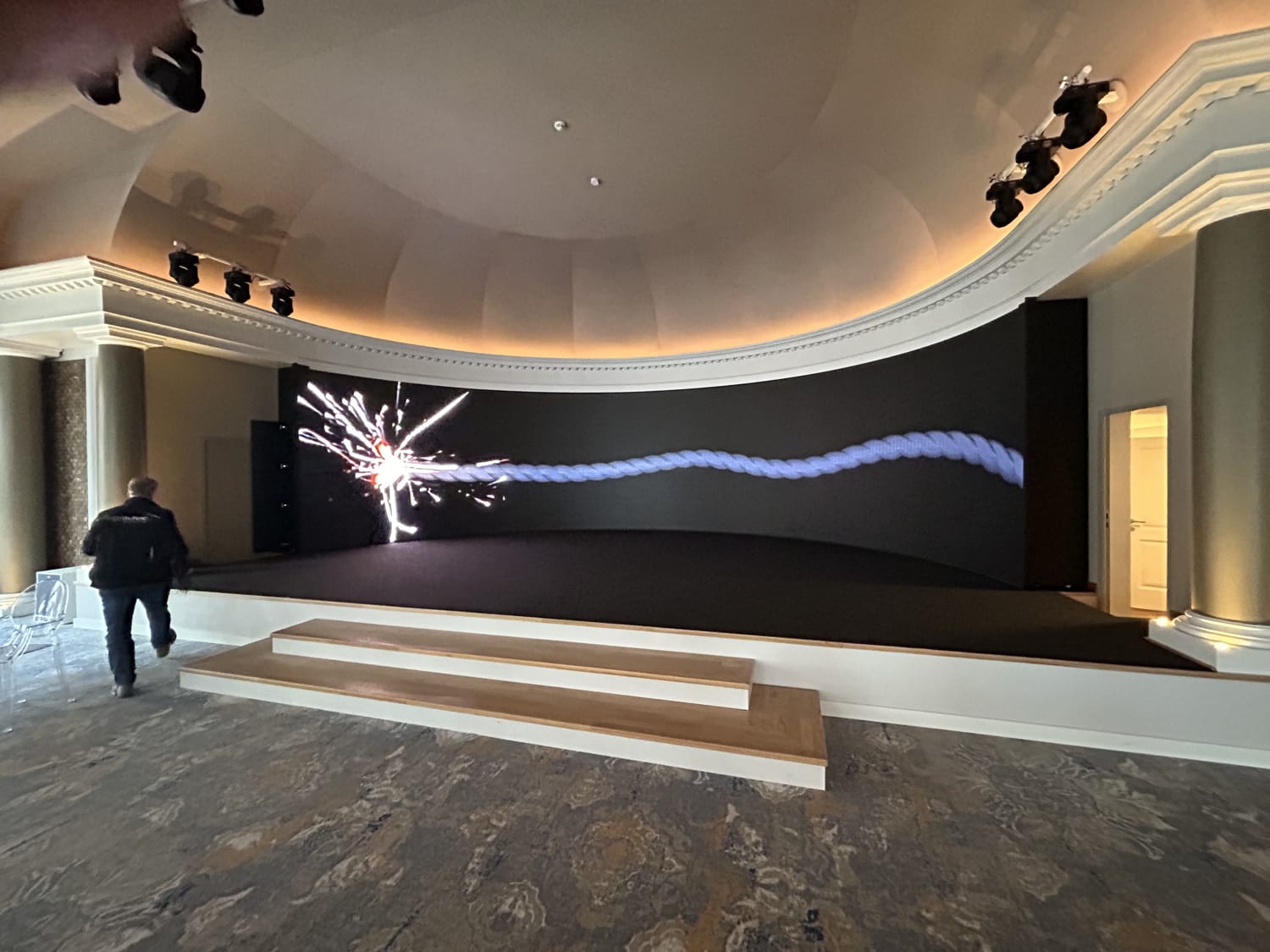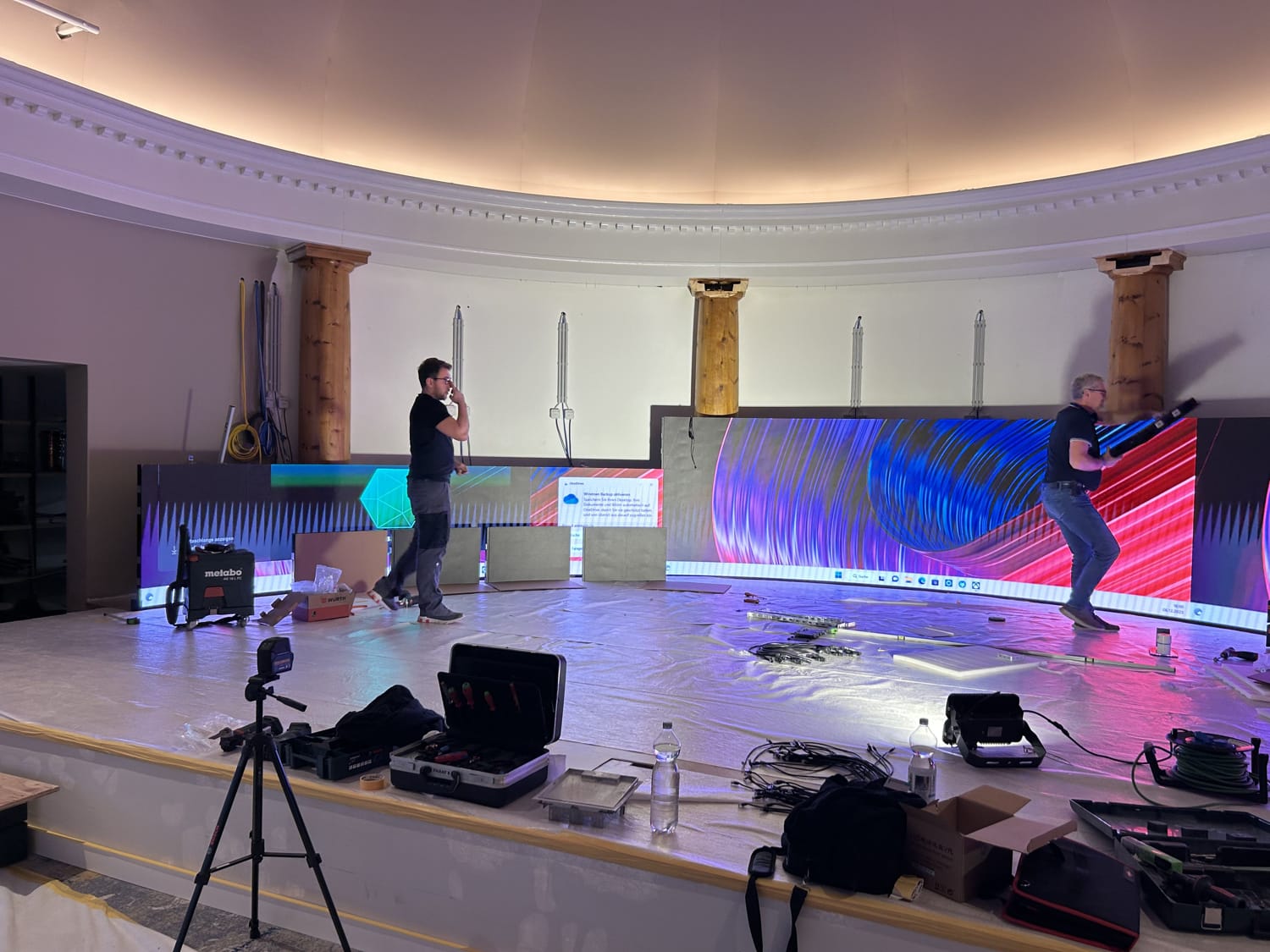 Unsere Partnerfirma Rogllivtec hat die gesamte technische Ausstattung des Veranstaltungsraums in Kitzbühel umgesetzt. Das LED-Display mit 2,6 mm Pixelabstand bietet 800 nit Helligkeit und eine beeindruckende Auflösung von 5.184 x 1.056 Pixeln auf einer Fläche von 13,5 x 2,75 Metern. Dank des curved Flex Modules mit Magnetbefestigung und einem Radius von ca. 4,50 Metern konnte das gebogene Display passgenau auf der bestehenden Bühne nach Naturmaß integriert werden und sorgt so für eine eindrucksvolle Präsentation.