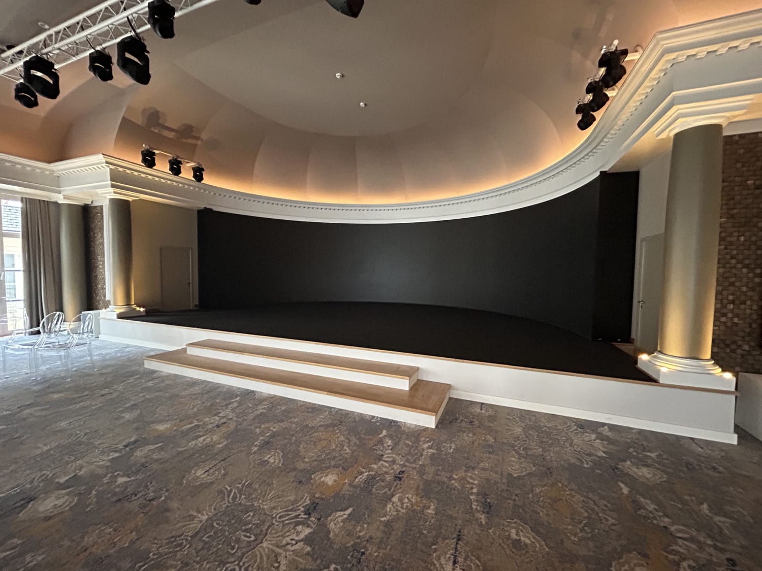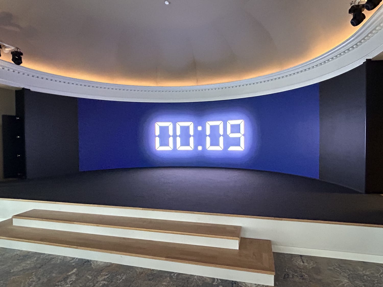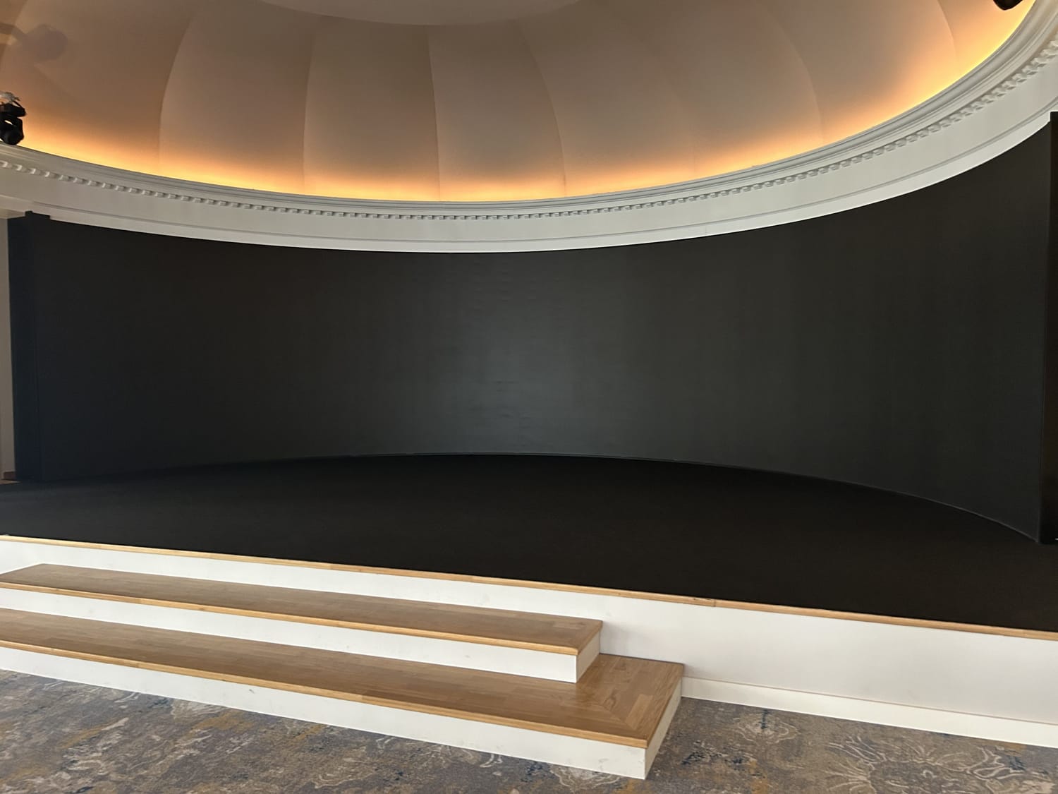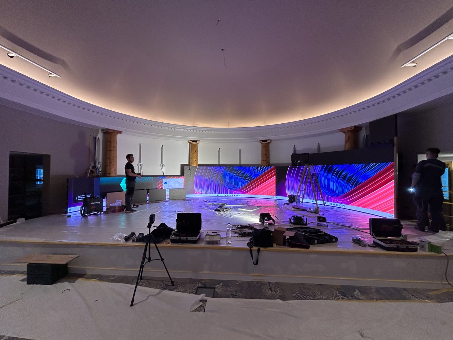 Unsere Partnerfirma Rogllivtec hat die gesamte technische Ausstattung des Veranstaltungsraums in Kitzbühel umgesetzt. Das LED-Display mit 2,6 mm Pixelabstand bietet 800 nit Helligkeit und eine beeindruckende Auflösung von 5.184 x 1.056 Pixeln auf einer Fläche von 13,5 x 2,75 Metern. Dank des curved Flex Modules mit Magnetbefestigung und einem Radius von ca. 4,50 Metern konnte das gebogene Display passgenau auf der bestehenden Bühne nach Naturmaß integriert werden und sorgt so für eine eindrucksvolle Präsentation.
