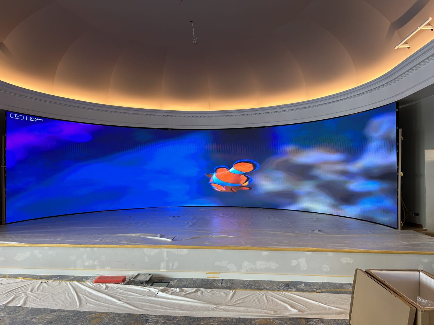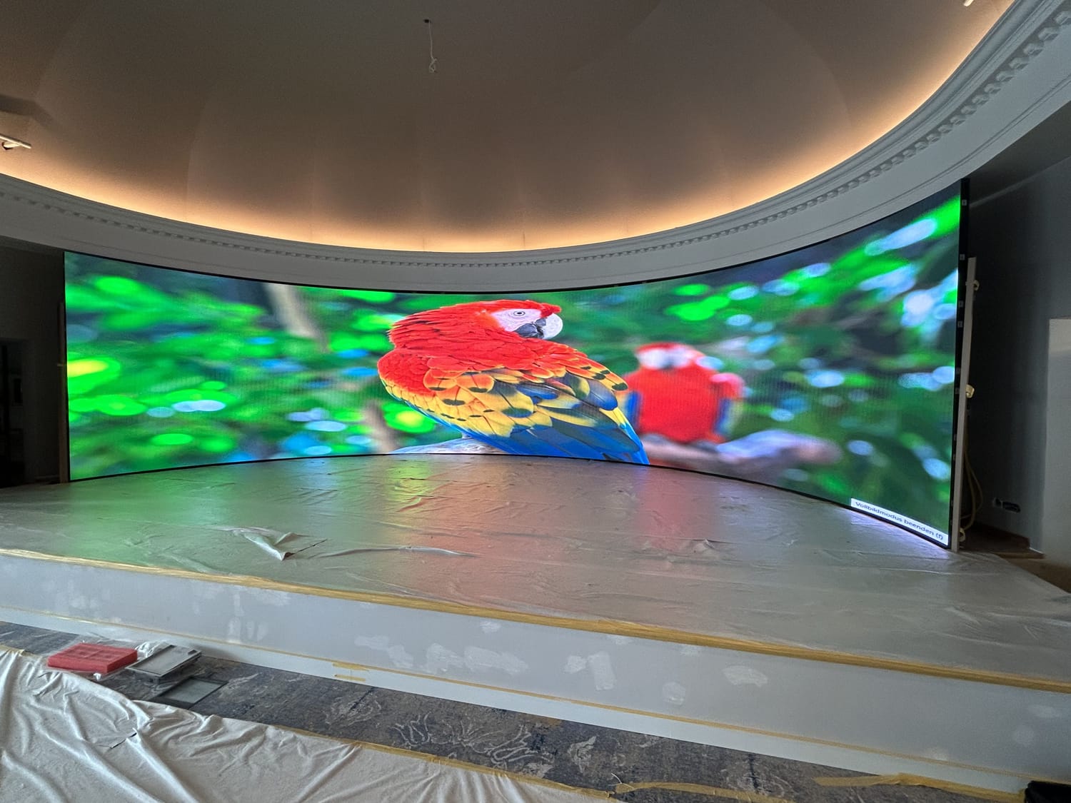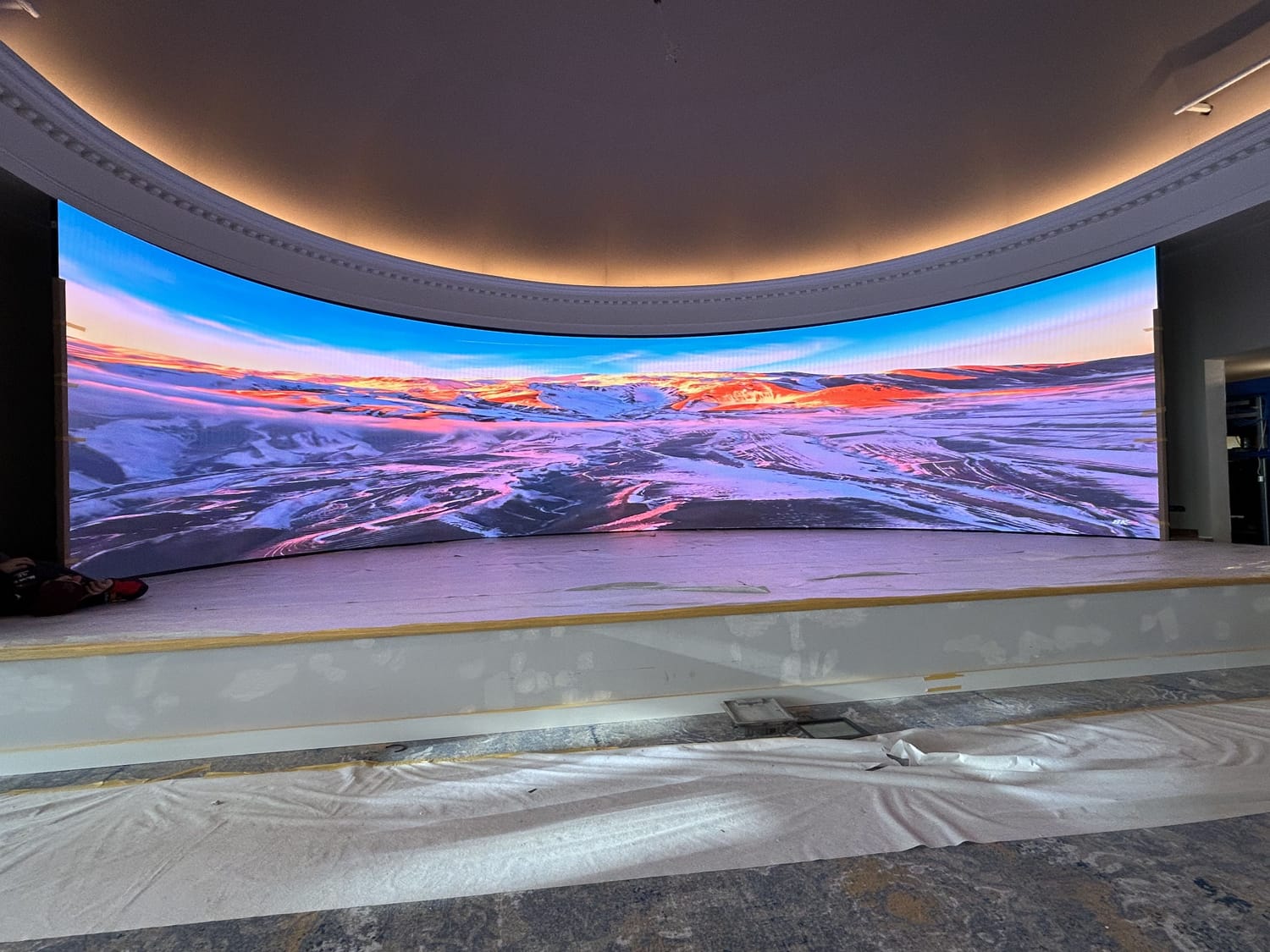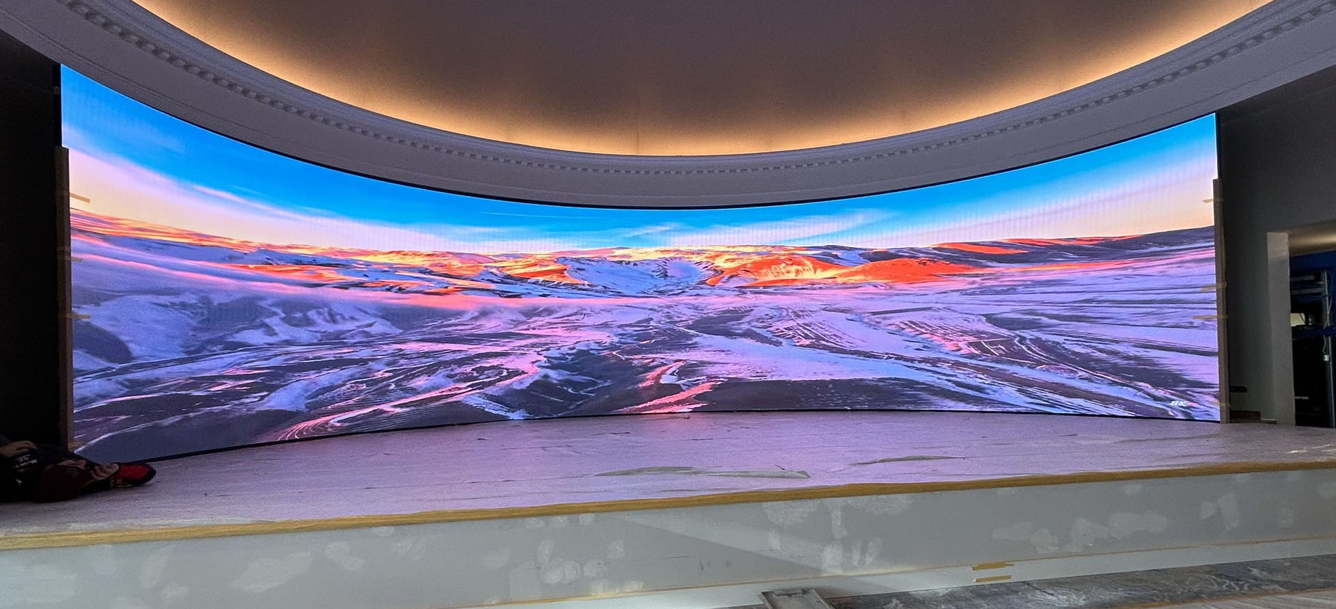 Unsere Partnerfirma Rogllivtec hat die gesamte technische Ausstattung des Veranstaltungsraums in Kitzbühel umgesetzt. Das LED-Display mit 2,6 mm Pixelabstand bietet 800 nit Helligkeit und eine beeindruckende Auflösung von 5.184 x 1.056 Pixeln auf einer Fläche von 13,5 x 2,75 Metern. Dank des curved Flex Modules mit Magnetbefestigung und einem Radius von ca. 4,50 Metern konnte das gebogene Display passgenau auf der bestehenden Bühne nach Naturmaß integriert werden und sorgt so für eine eindrucksvolle Präsentation.