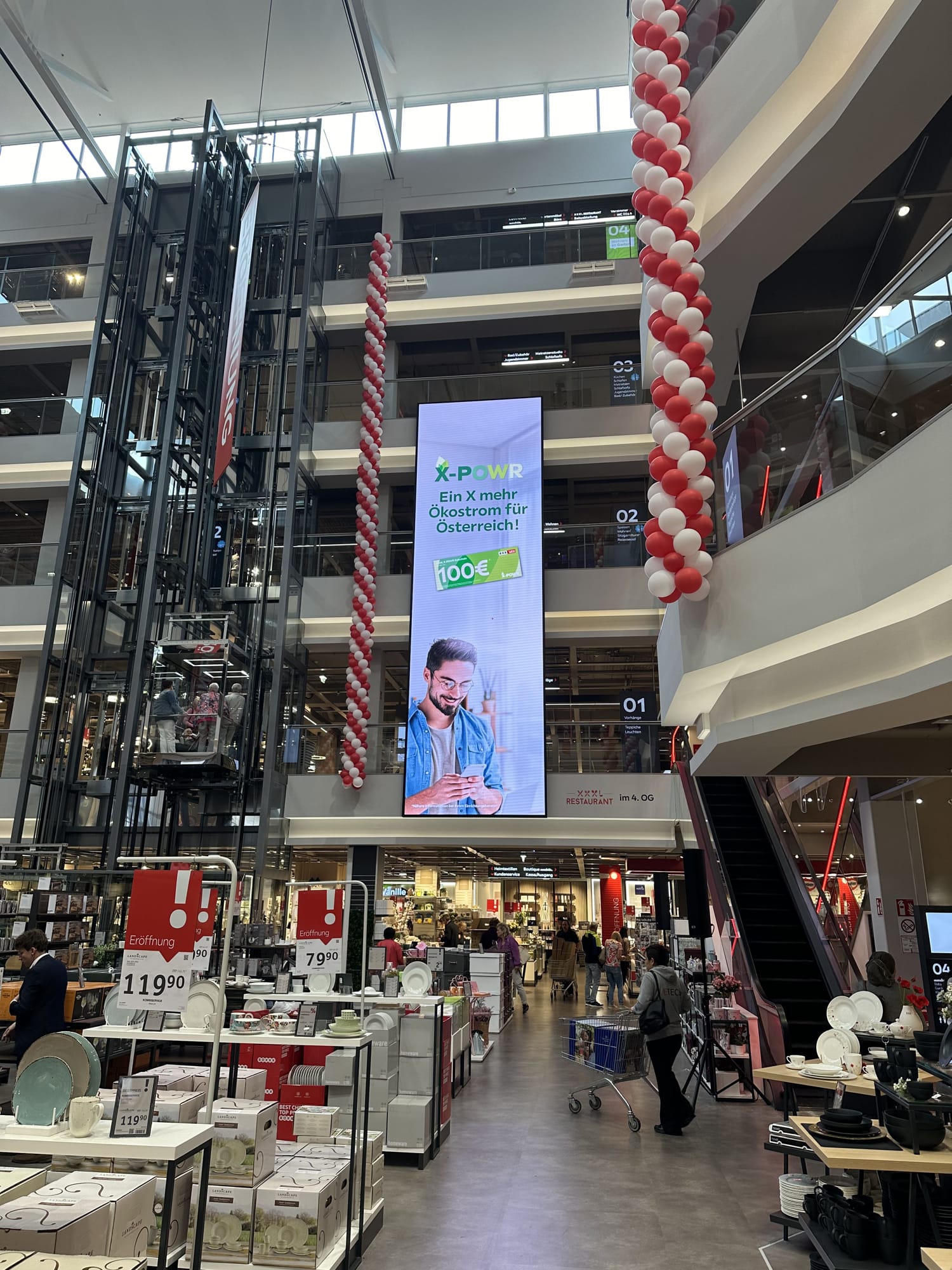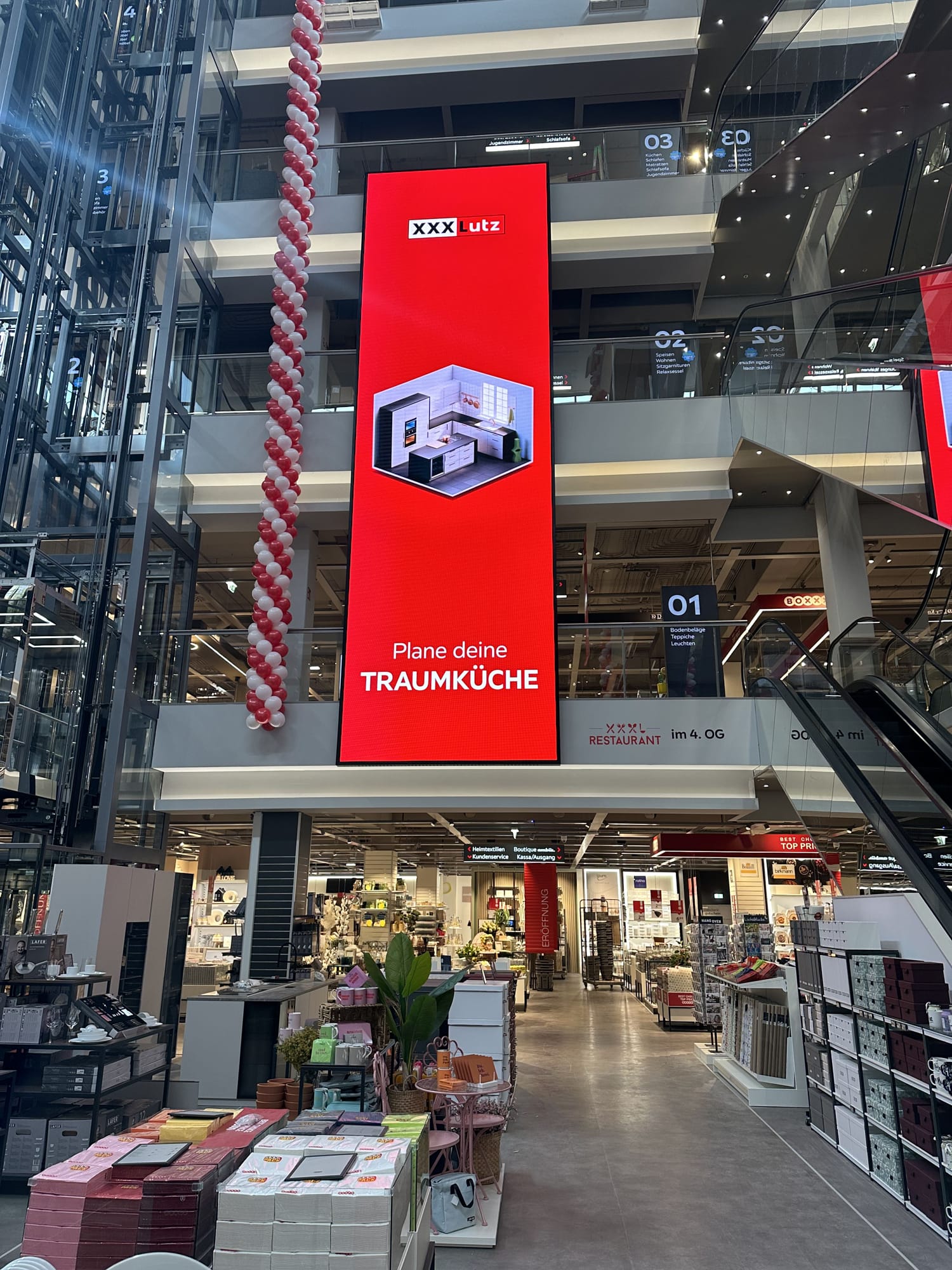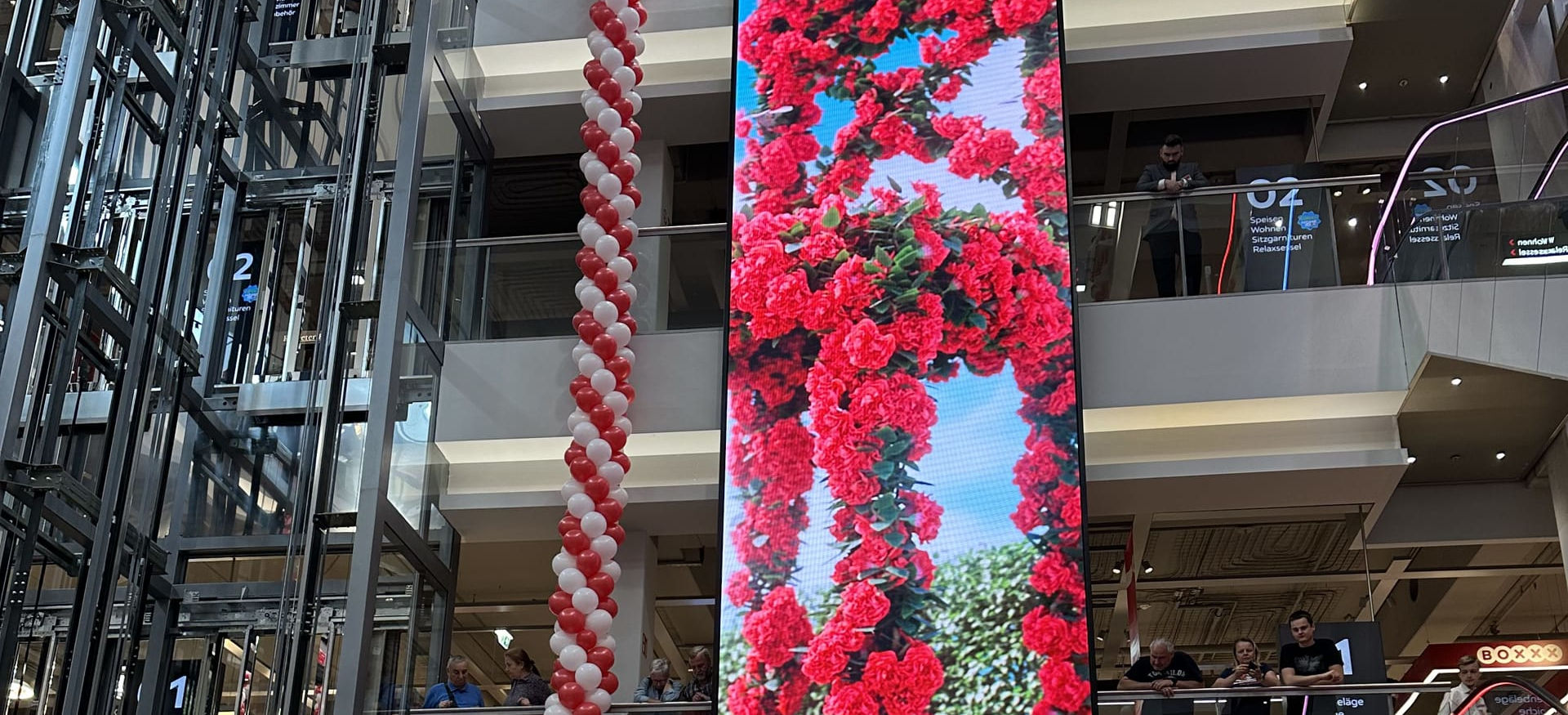Das LED-Display mit 3,91 mm Pixelabstand und 800 nit Helligkeit misst 3 x 10 Meter und überzeugt durch gestochen scharfe Darstellung. Besonders beeindruckend ist das sonderformatige Display, das 10 Meter hoch im Lichthof über fast drei Geschosse installiert wurde und so die Architektur spektakulär in Szene setzt.