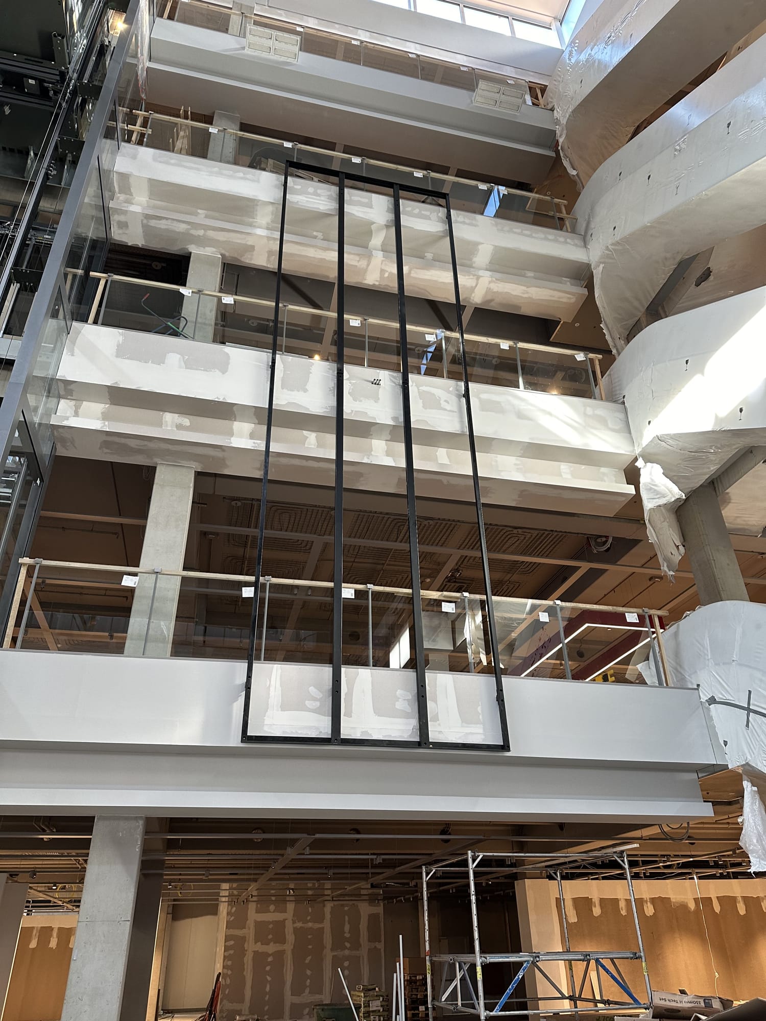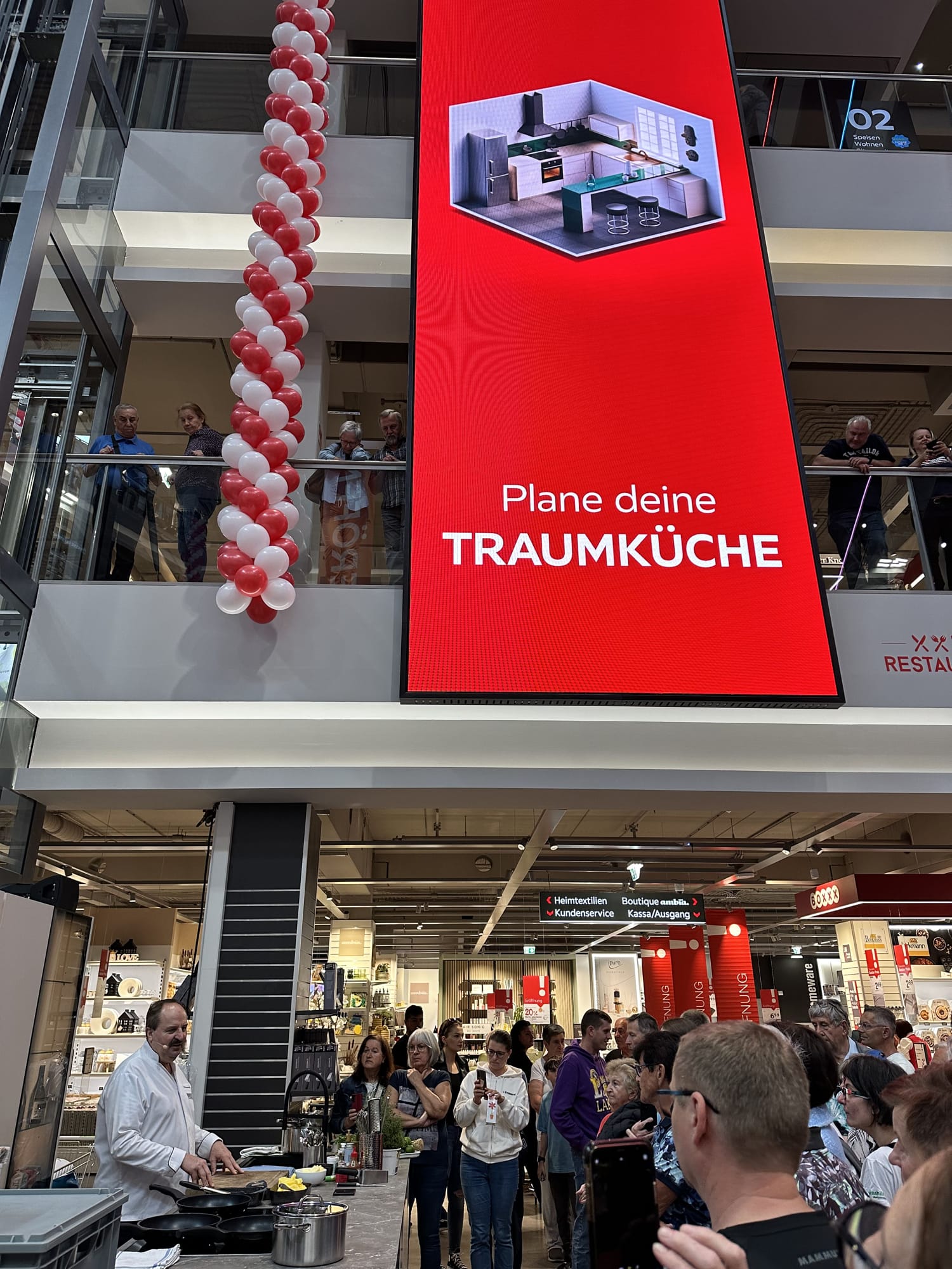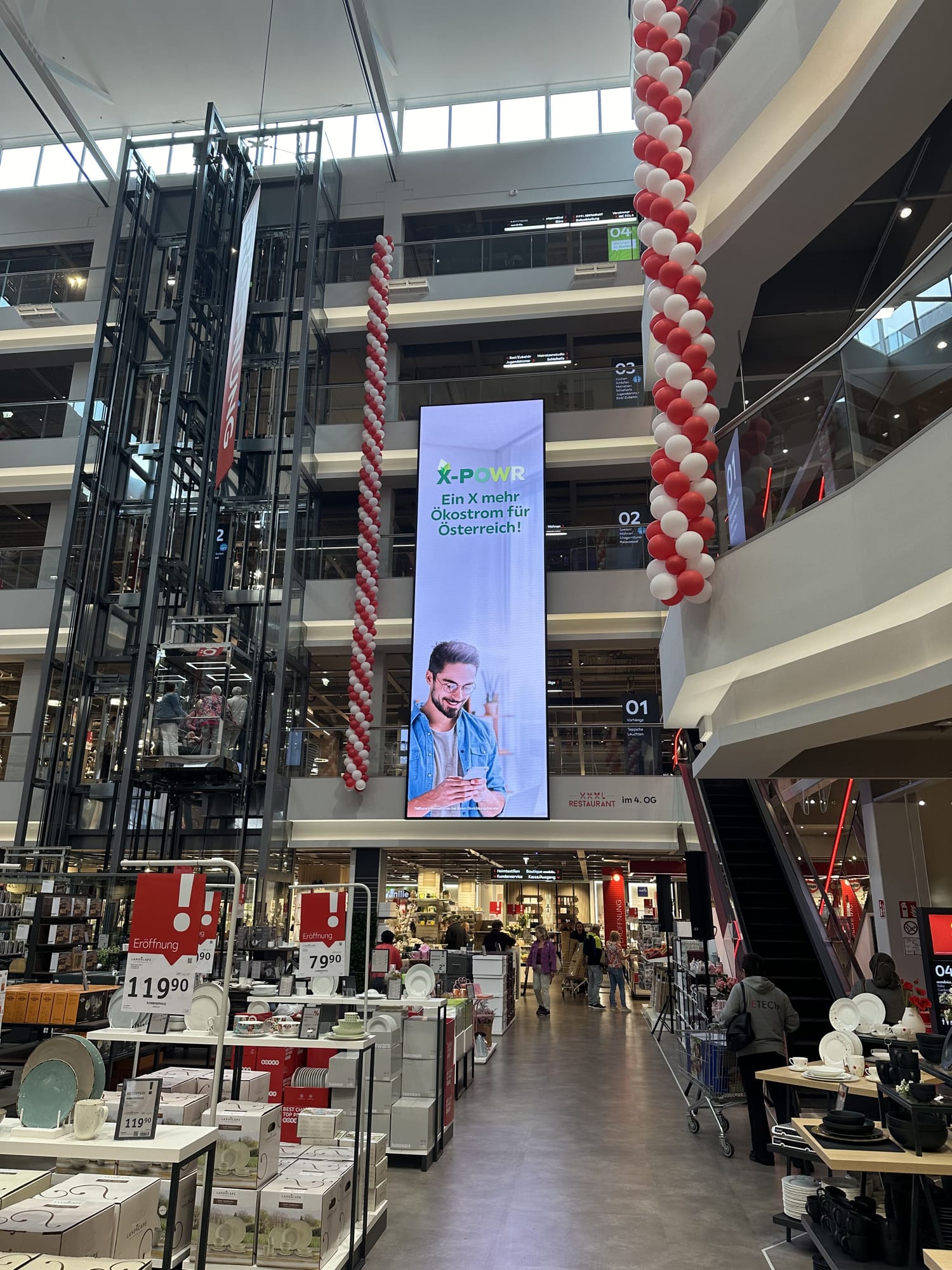 Das LED-Display mit 3,91 mm Pixelabstand und 800 nit Helligkeit misst 3 x 10 Meter und überzeugt durch gestochen scharfe Darstellung. Besonders beeindruckend ist das sonderformatige Display, das 10 Meter hoch im Lichthof über fast drei Geschosse installiert wurde und so die Architektur spektakulär in Szene setzt.