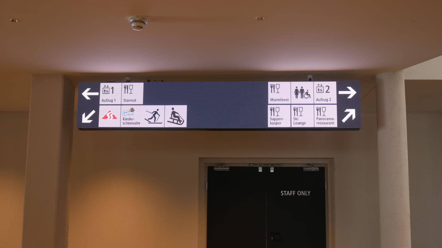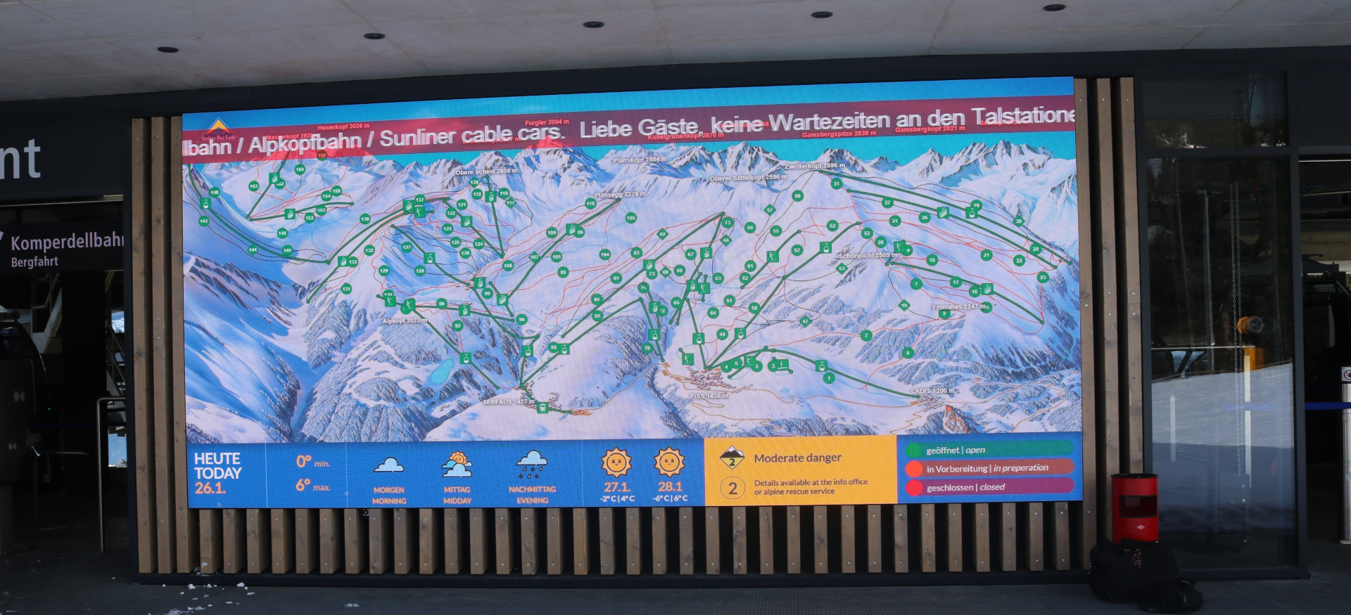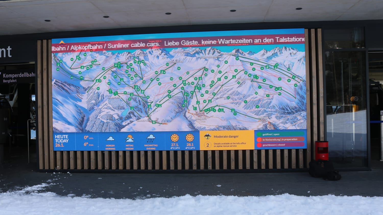 Die LED-Displays mit 3,9 mm Pixelabstand, Top SMD LEDs und einer Helligkeit von 5.000 nit sind bis auf 1.800 m Seehöhe einsetzbar und liefern brillante Inhalte selbst unter anspruchsvollen Bedingungen. Insgesamt wurden 10 Screens für die Bergbahnen in Serfaus installiert, aufgeteilt auf Tal-, Mittel- und Bergstation. Während die kleineren Screens als informative Hinweistafeln dienen, präsentieren die größeren Displays eindrucksvoll Panoramaansichten und Webcam-Bilder.
