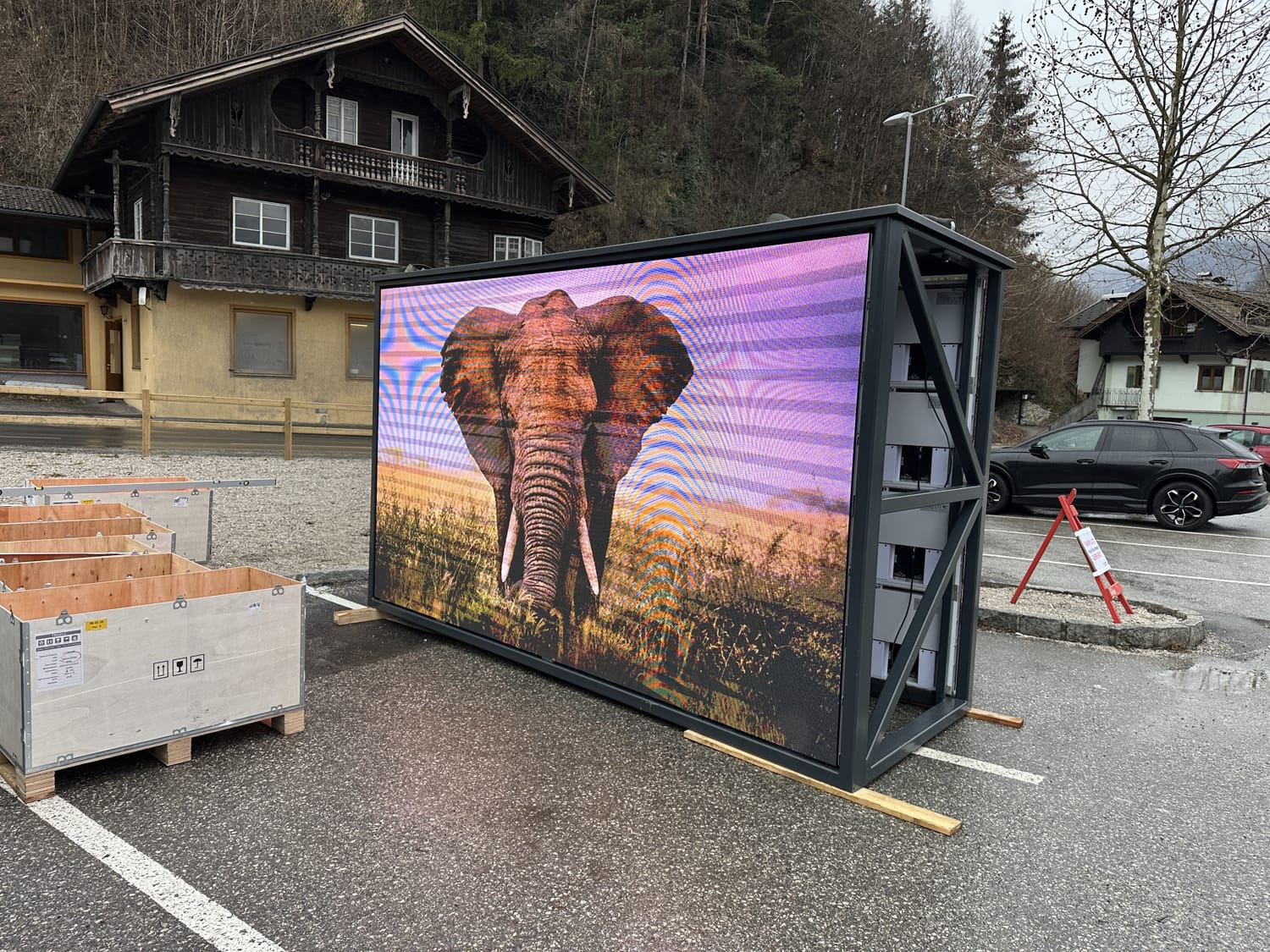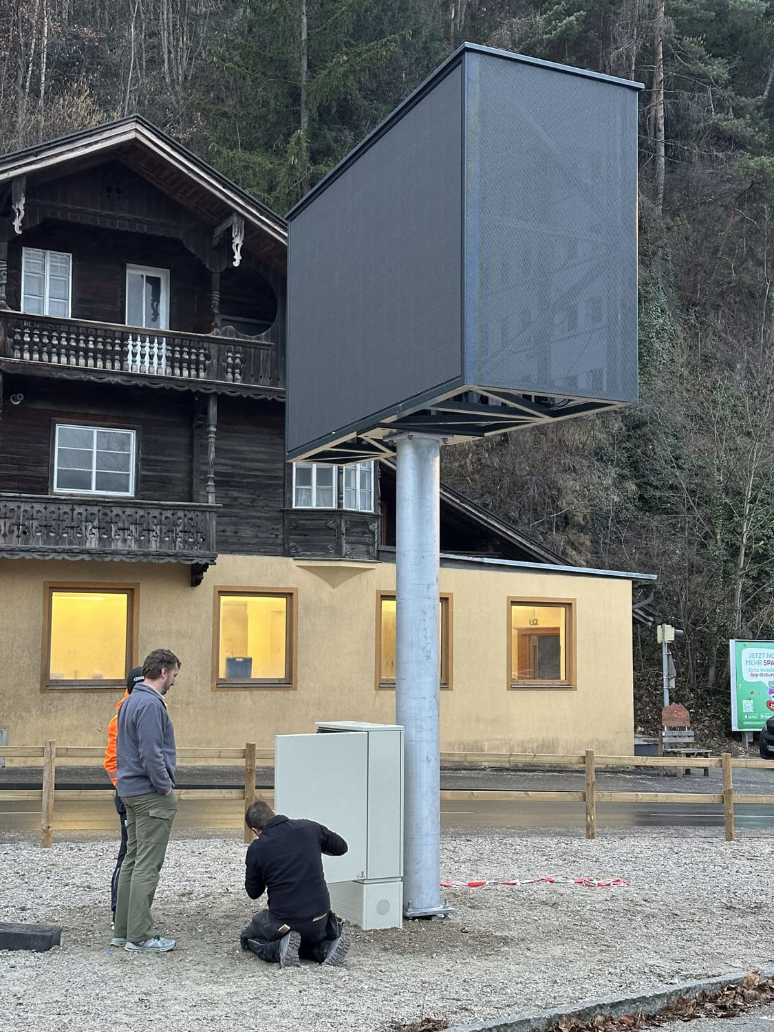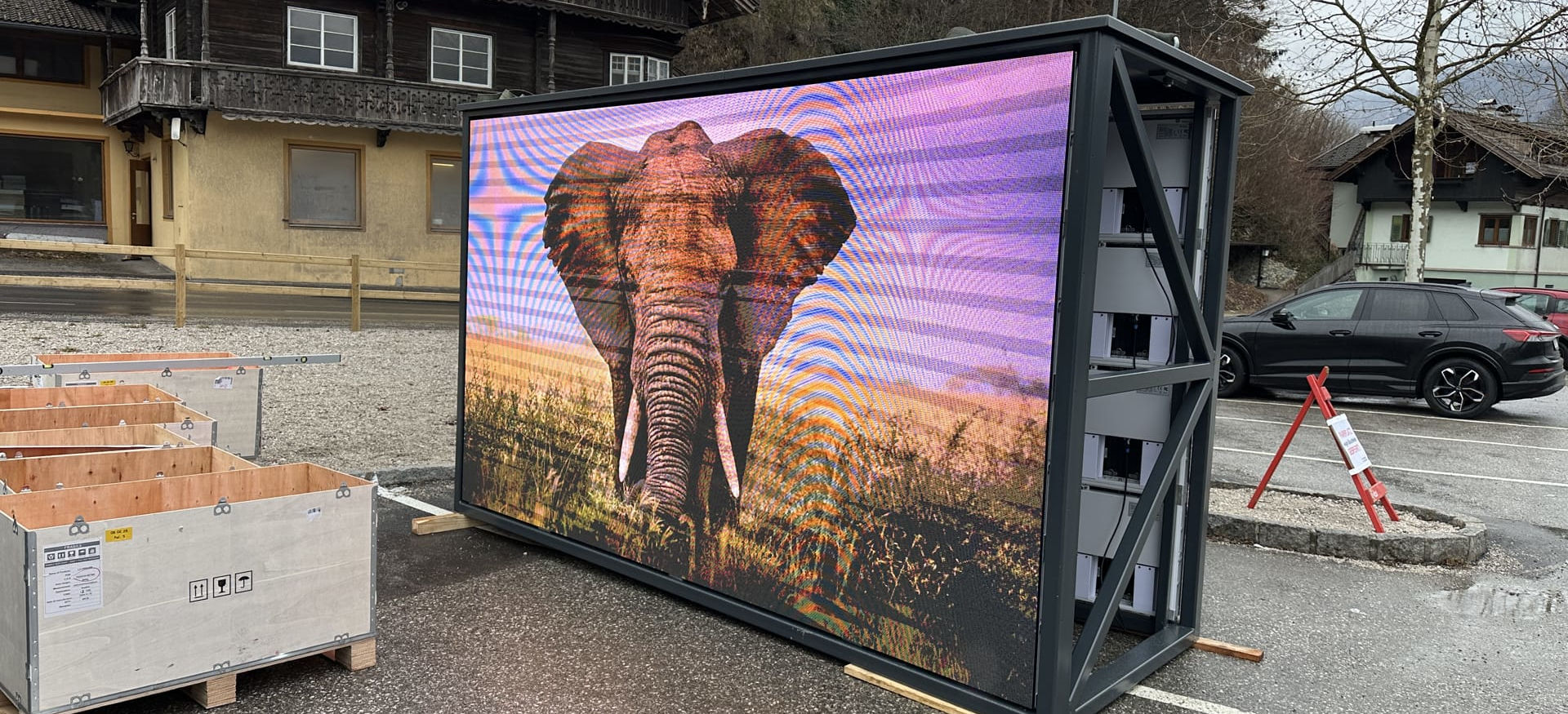 Das doppelseitige LED-Display mit einer Größe von 3,5 x 2 Metern und einem Pixelabstand von 3,9 mm bietet gestochen scharfe Bilder und eignet sich perfekt für den Einsatz im touristischen Umfeld. Dank voller Sonnenlichttauglichkeit, EMC-Prüfung und automatischer Helligkeitsregelung ist eine klare Sichtbarkeit zu jeder Tageszeit garantiert – ideal, um Gäste zuverlässig über Veranstaltungen, Sehenswürdigkeiten oder aktuelle Informationen zu informieren. Die Montage erfolgte auf einer maßgefertigten Unterkonstruktion eines regionalen Metallbauers, die Funktionalität mit regionaler Wertschöpfung verbindet und so ein stabiles Fundament für moderne Tourismuskommunikation schafft.