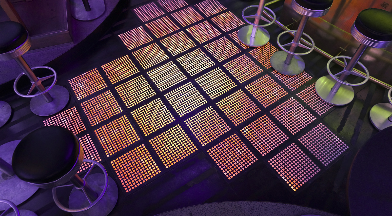 Für zusätzliche Stimmung sorgen die Farbeffekte des LED-Bodens im Bar-Bereich. Mehrere Pixelpaneele wurden dort sicher unter einer extrem belastbaren Abdeckung ein den Boden integriert. Auch auf der etwas erhöhten Tanzfläche wurden vereinzelt einige dieser Paneele eingesetzt. Der Pixelabstand ist mit 25 mm relativ groß, für diesen Zweck aber durchaus ausreichend ohne dabei das Budget zu schwer zu belasten.
