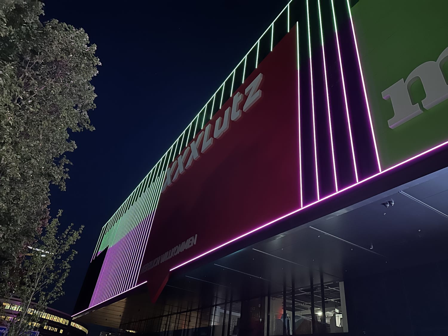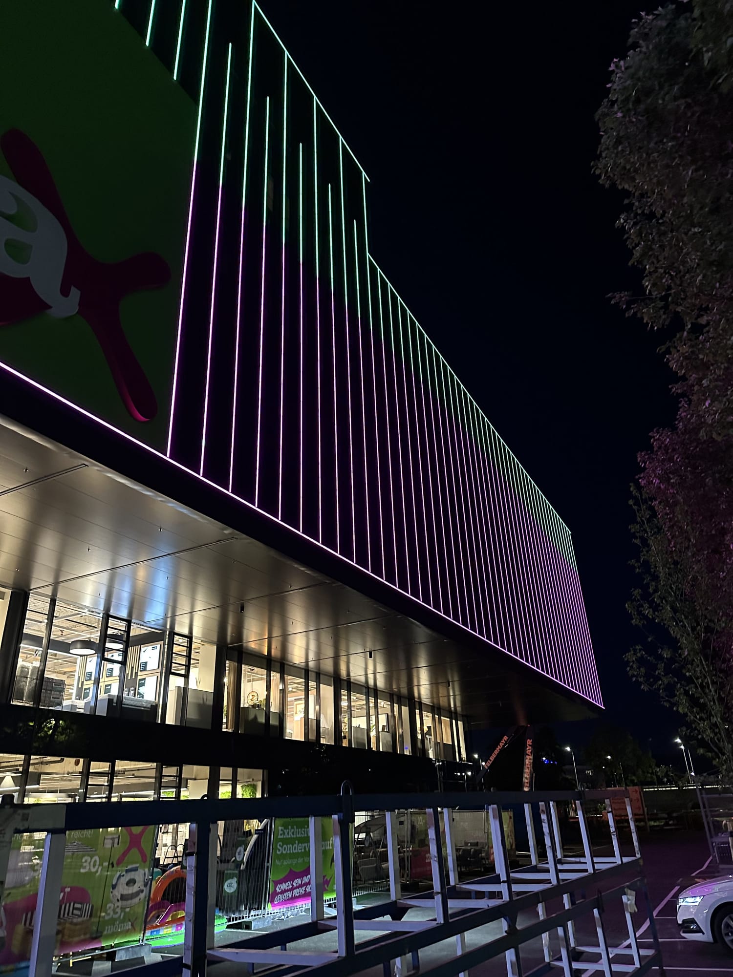 Mit ca. 9.000 m² Fassadenfläche handelt es sich um die größte Lichtfassade Österreichs. Besonders beeindruckend sind die ca. 4.500 Meter senkrechte und waagrechte pixelgesteuerte Lichtlinien, die in den Alu-Lisenen der Fassade verbaut wurden. Ein schwarzes Cover sorgt für eine perfekte Wirkung bei Tageslicht, während die gezielte Illumination den Standort hervorhebt und den hohen gestalterischen Anspruch des Unternehmens unterstreicht.