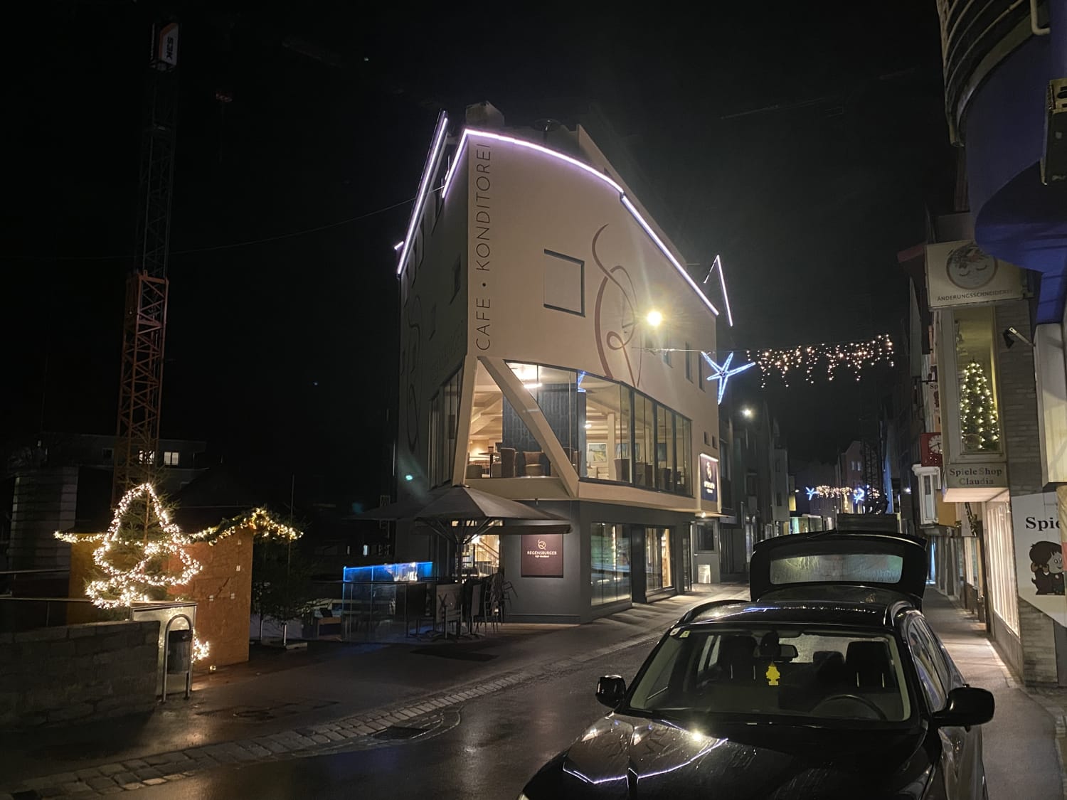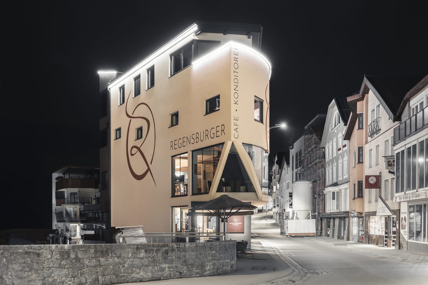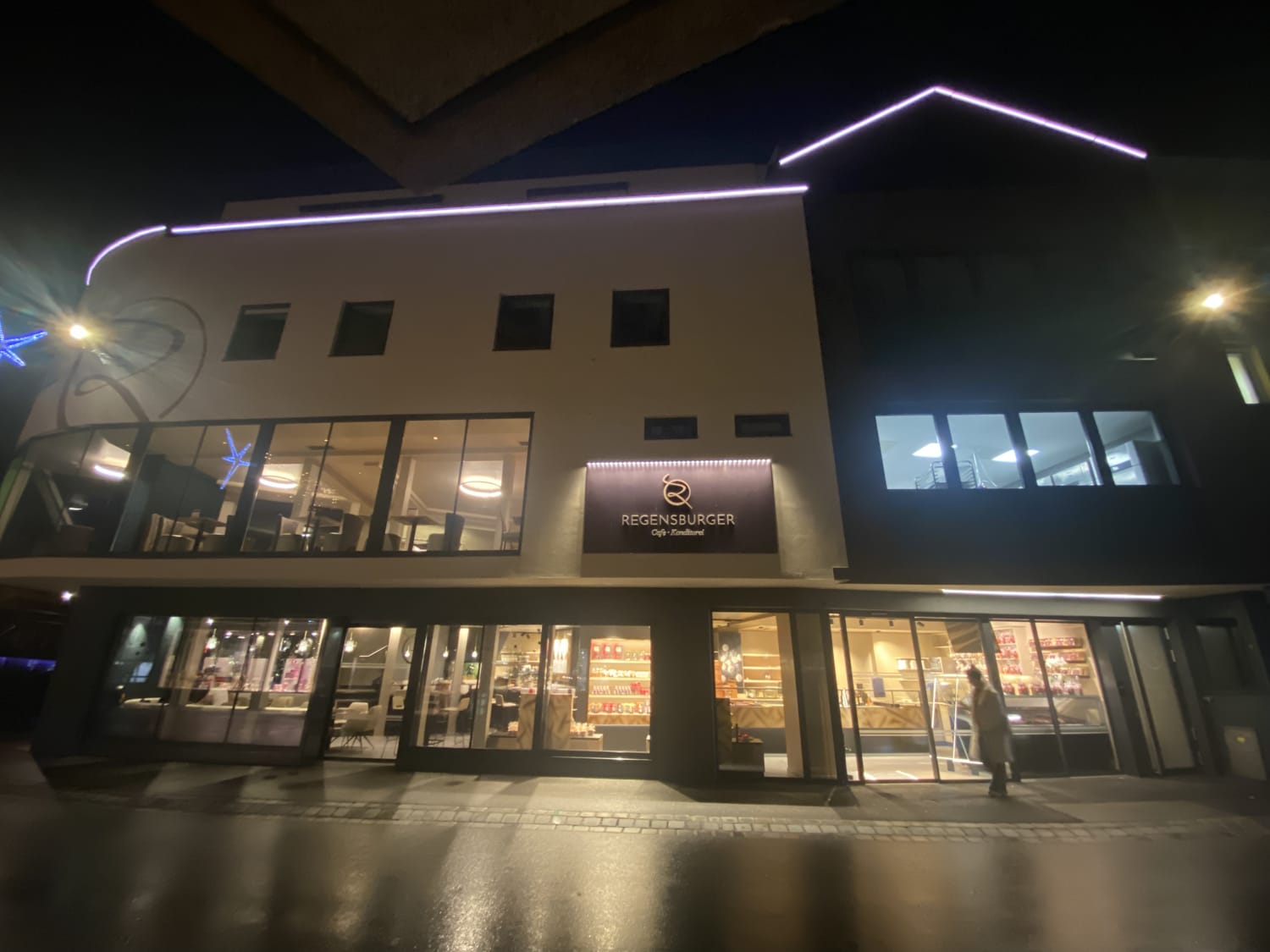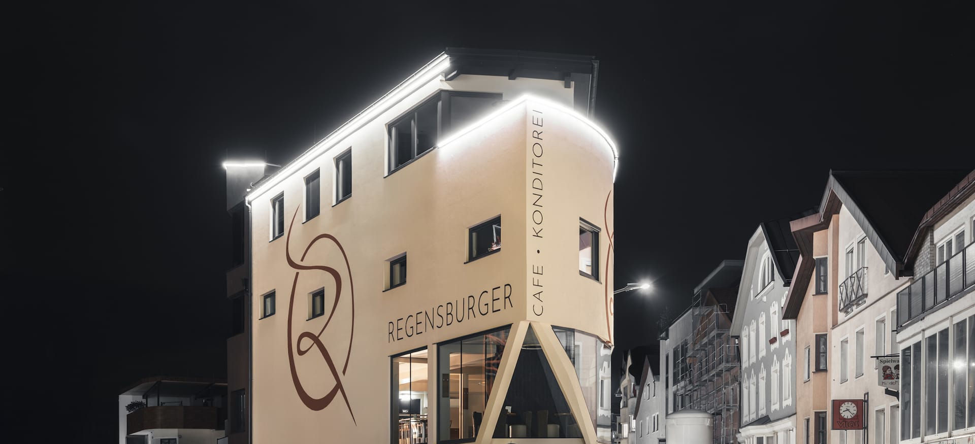 Pixelgesteuerte Lichtlinien mit Black/White-Cover setzen das Café Regensburger und die Konditorei in Imst eindrucksvoll in Szene. Im Rahmen der umfangreichen Umbauarbeiten wurde der gesamte Außenauftritt neu gestaltet und mit einer einzigartigen Konturbeleuchtung sowie einer markanten Beschriftung veredelt. So stilsicher wie die kunstvoll kreierten Mehlspeisen, die unser Konditormeister zaubert, zieht das Ensemble die Blicke von Gästen und Passanten weit über die Stadtgrenzen hinaus auf sich.