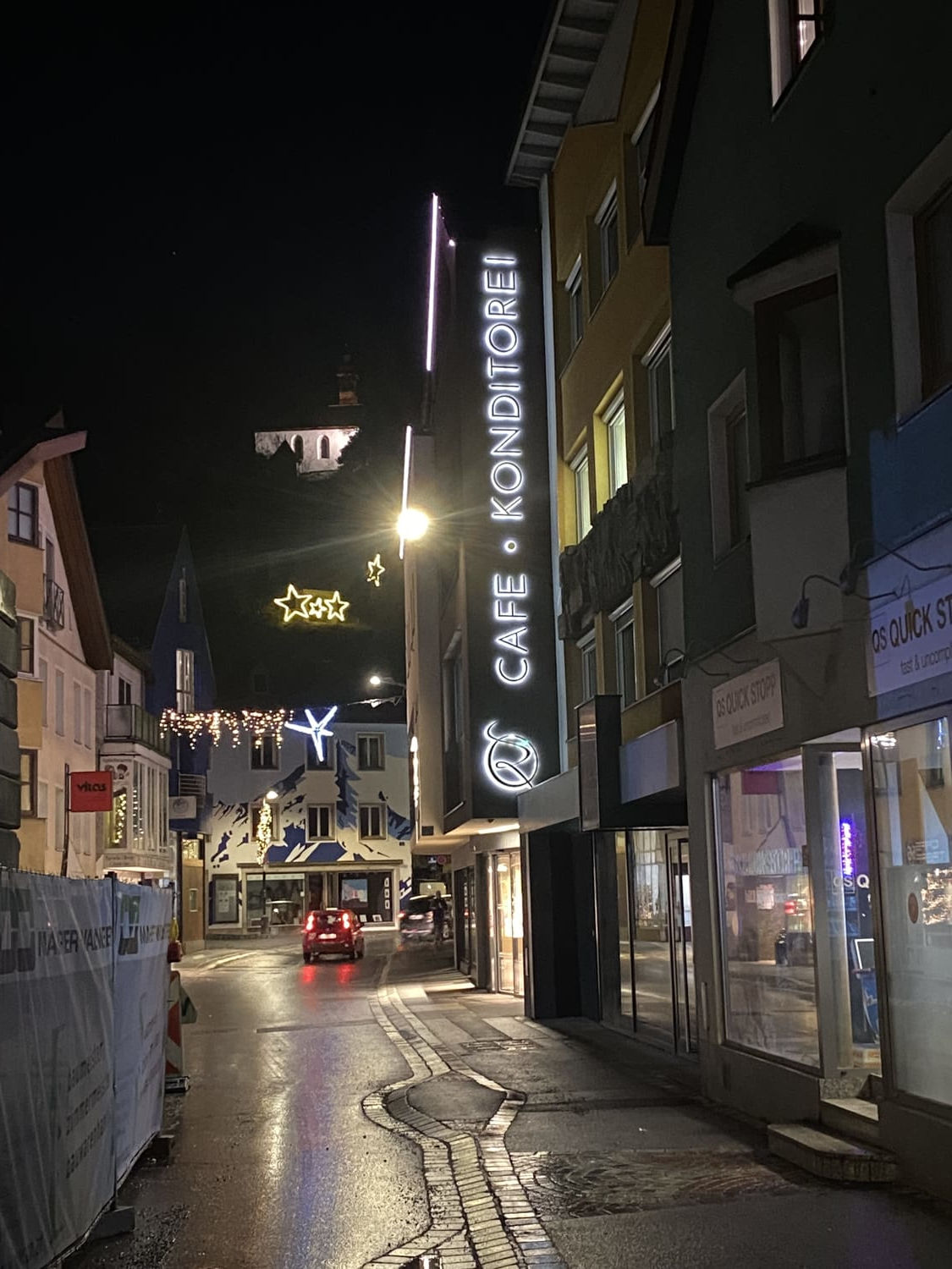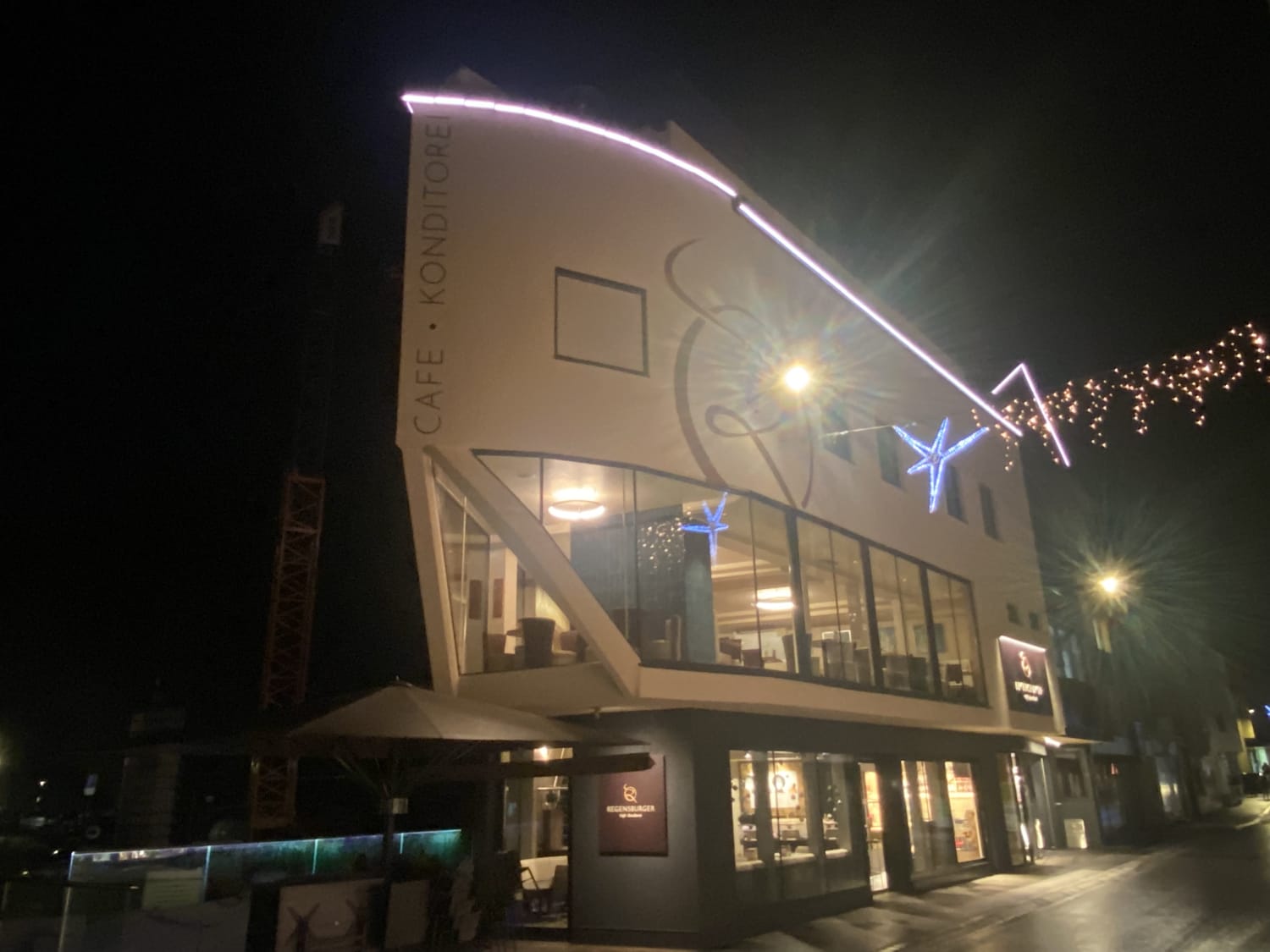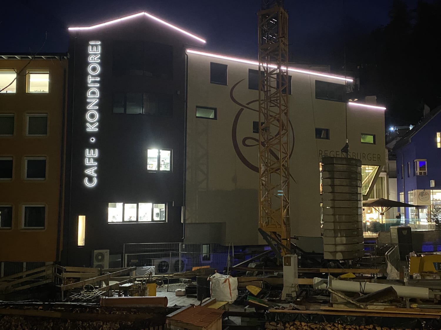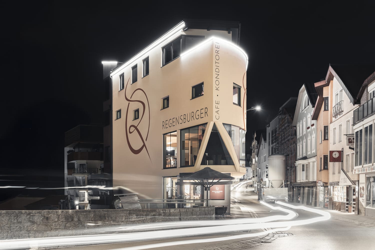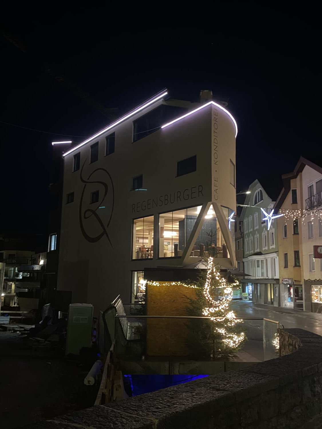 Pixelgesteuerte Lichtlinien mit Black/White-Cover setzen das Café Regensburger und die Konditorei in Imst eindrucksvoll in Szene. Im Rahmen der umfangreichen Umbauarbeiten wurde der gesamte Außenauftritt neu gestaltet und mit einer einzigartigen Konturbeleuchtung sowie einer markanten Beschriftung veredelt. So stilsicher wie die kunstvoll kreierten Mehlspeisen, die unser Konditormeister zaubert, zieht das Ensemble die Blicke von Gästen und Passanten weit über die Stadtgrenzen hinaus auf sich.